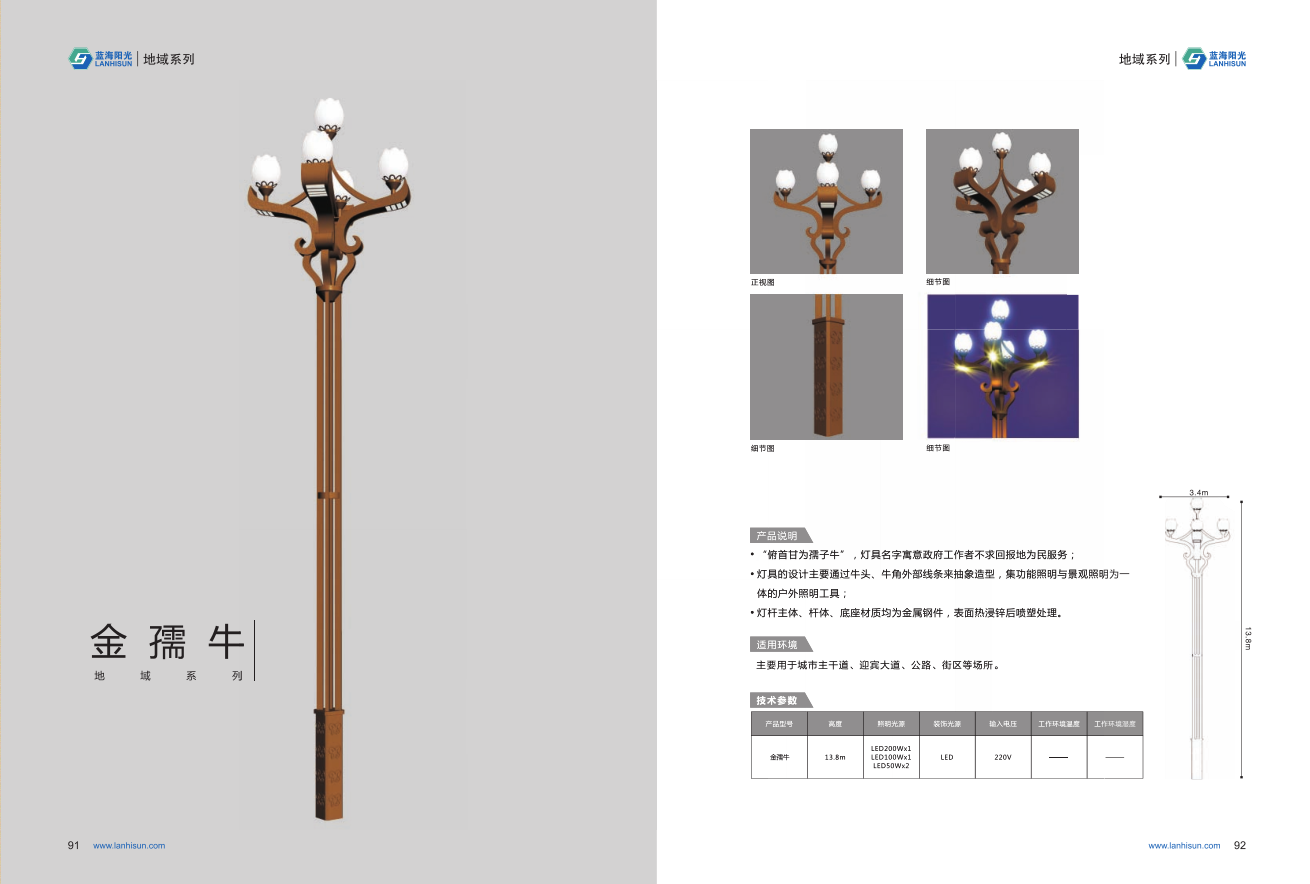 1、高度為6-16米; 2、花葉光源為4組LED光源,色溫2500-6500K,其余光源為LED裝飾光源,每個光源功率為30-60W; 3、LED驅動電源壽命可達五年; 4、整體熱鍍鋅噴塑,保證燈桿15年不生銹; 5、可以根據使用地區的地域文化、產業特點等進行文化定制;