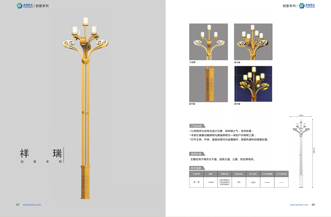 1、高度為6-16米; 2、花葉光源為4組LED光源,色溫2500-6500K,其余光源為LED裝飾光源,每個光源功率為30-60W; 3、LED驅動電源壽命可達五年; 4、整體熱鍍鋅噴塑,保證燈桿15年不生銹; 5、可以根據(jù)使用地區(qū)的地域文化、產(chǎn)業(yè)特點等進行文化定制;