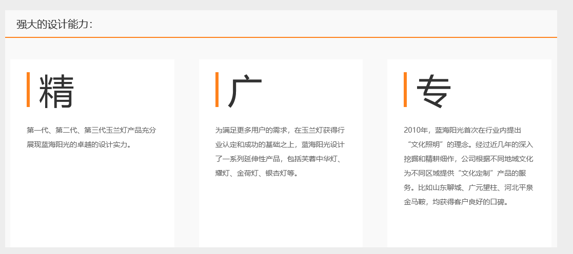 青島藍(lán)海陽(yáng)光能源有限公司設(shè)計(jì)中心下設(shè)方案設(shè)計(jì)部和機(jī)械結(jié)構(gòu)部?jī)蓚€(gè)部門(mén)。其中方案設(shè)計(jì)部負(fù)責(zé)照明方案及相關(guān)產(chǎn)品燈型的設(shè)計(jì),機(jī)械機(jī)構(gòu)部主要負(fù)責(zé)各類(lèi)設(shè)計(jì)產(chǎn)品的試制。 目前,設(shè)計(jì)中心提供的設(shè)計(jì)方案用于全國(guó)近30多個(gè)城市,經(jīng)典案例多達(dá)100余個(gè),致力于成為國(guó)內(nèi)一流的設(shè)計(jì)團(tuán)隊(duì),為客戶(hù)提供高品質(zhì)的設(shè)計(jì)服務(wù)。